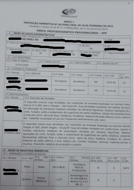 Os principais itens desse formulário definem se o trabalhador tem ou não direito ao computo do tempo especial, os que considero principais, são: “14.2”; “15.3”; “15.4”; “15.5”.